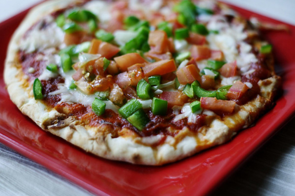 Σε μια μεγάλη πίτα άπλωσε με κουτάλι σάλτσα ντομάτας, κίτρινο τυρί τριμμένο, πιπεριά και ντομάτα ψιλοκομμένη. Ψήσε στον φούρνο, σε ταψί στρωμένο με λαδόκολλα, στους 200οC για 6-7 λεπτά.