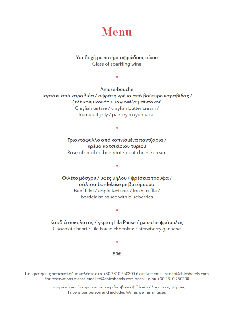 Για την Ημέρα του Αγίου Βαλεντίνου, η ομάδα του Daios Luxury Living έχει ετοιμάσει ένα ειδικά διαμορφωμένο μενού, σχεδιασμένο για να ενισχύσει τη ρομαντική διάθεση της βραδιάς. Πρωταγωνιστούν δημιουργικές προτάσεις που συνδυάζουν premium πρώτες ύλες. Ανάμεσα στα πιάτα της βραδιάς ξεχωρίζουν επιλογές που τιμούν την εποχή, όπως εκλεπτυσμένα θαλασσινά, πληθωρικά πιάτα με βάση το κρέας και ένα επιδόρπιο-έκπληξη που αποτυπώνει την αισθητική του έρωτα σε κάθε μπουκιά. Η συνολική εμπειρία ολοκληρώνεται με επιλεγμένη λίστα κρασιών και signature κοκτέιλ.